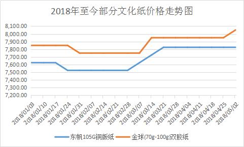 不過,從數據上來看,進入2018年,文化紙價格的漲幅并沒有某媒體所渲染的那么嚴重,紙張價格上漲主要集中在白板紙、瓦楞紙、箱板紙等品種。數據顯示,2018年初,文化紙出廠價還出現了小幅度下滑,而進入3-5月,由于出版業進入秋季學生教輔備貨期,文化紙出現需求旺季,同樣以東帆105G銅版紙和金球(70g-100g)雙膠紙為例,二者的全國平均出廠價出現了200元/每噸左右的上漲,屬于正常的季節性調整,遠低于去年同期近千元每噸的漲幅。