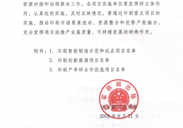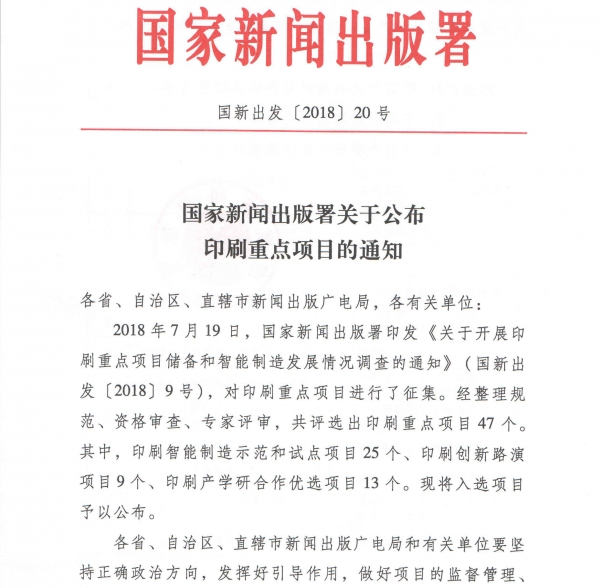 9月21日,國家新聞出版署以“國新出發【2018】20號”向各省、自治區、直轄市新聞出版廣電局及各有關單位印發了《國家新聞出版署關于公布印刷重點項目的通知》。