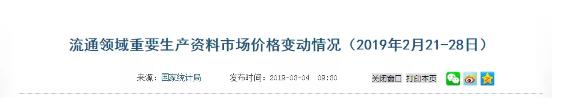2019年3月4日,國家統計局公布最新一期流通領域重要生產資料市場價格變動情況(2019年2月21-28日)。