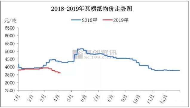2018-2019年瓦楞紙均價走勢圖(瓦楞紙一季度市場回顧):