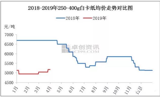 2018-2019年250-400g白卡紙均價走勢對比圖(全國白卡紙市場行情回顧):