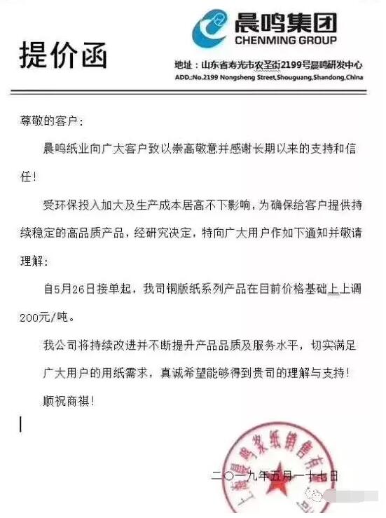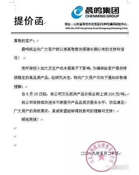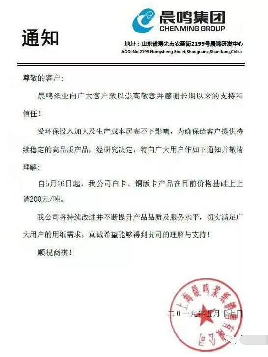 山東晨鳴紙業銷售有限公司:受環保投入加大及生產成本居高不下影響,自5月25日起,我公司文化紙類產品價格上調200元/噸。