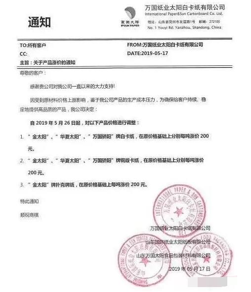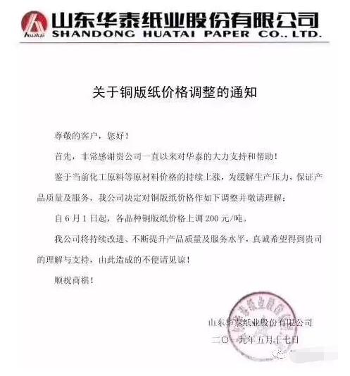 山東太陽紙業股份有限公司:經過對原材料市場趨勢分析,以及基于對成品市場未來一段時間供需關系及哭殘現狀的判斷,對太陽紙業生產并在國內市場銷售的產品價格做如下調整:1、普通類涂布紙在目前的執行價格基礎上,上調200元/噸。2、普通類膠版紙在目前的執行價格基礎上,上調200元/噸。以上價格調整,自2019年6月1日起執行。