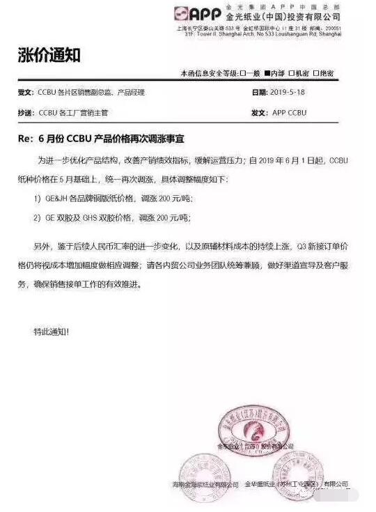 APP:為進一步優化產品結構,改善產銷指標,自2019年6月1日起,CCBU紙種價格在5月基礎上,統一再次調漲,具體調整幅度如下:1)GE&JH各品牌銅版紙價格,調漲200元/噸;2)GE雙膠紙及GHS雙膠紙價格,調漲200元/噸。