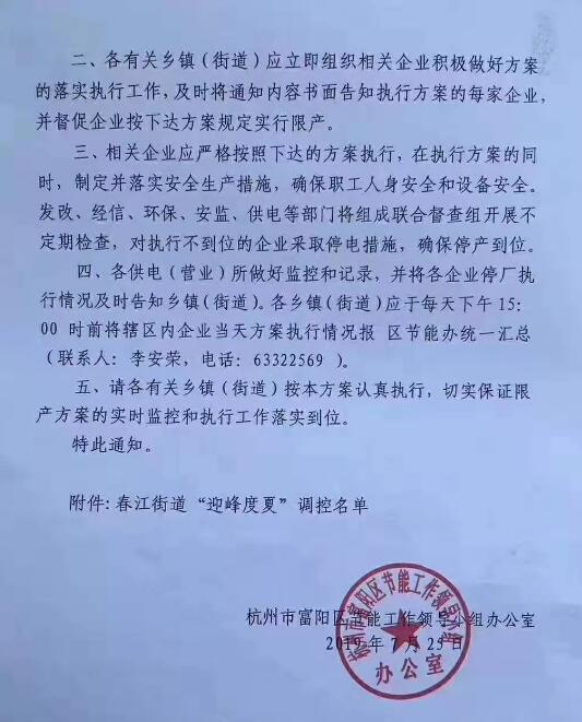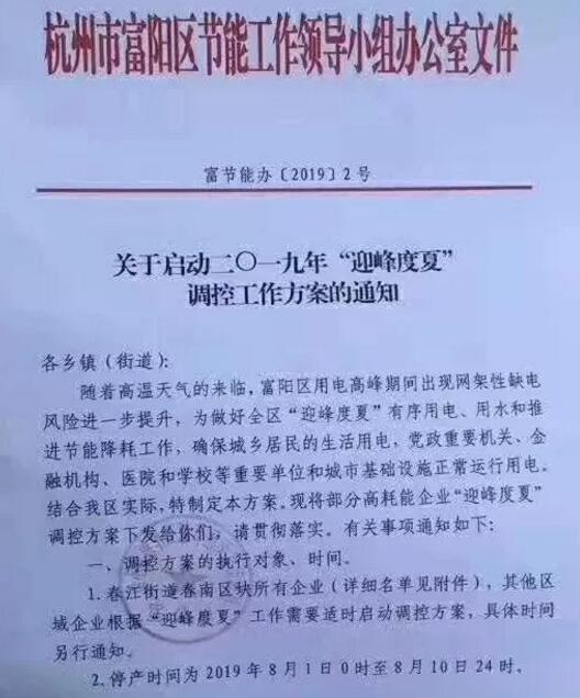 通知稱,高溫天氣的來臨,富陽區(qū)用電高峰期出現(xiàn)網(wǎng)架性缺電風(fēng)險(xiǎn)進(jìn)一步提升,為做好“迎峰度夏”有序用電、用水和推進(jìn)節(jié)能降耗工作,確保城鄉(xiāng)居民的生活用電和城市基礎(chǔ)設(shè)施正常運(yùn)行用電,現(xiàn)下發(fā)部分高耗能企業(yè)“迎峰度夏”調(diào)控方案。