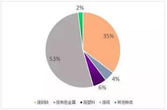 從2018年回收數據分析,廢紙回收量最大,回收量達76.8萬噸,占比53%,其次是廢鋼鐵,回收量為51.6萬噸,占比35%,廢塑料、廢玻璃、廢橡膠、其他種類回收量分別為8.6萬噸、0.8萬噸、0.2萬噸、2萬噸。、