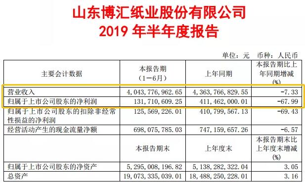 2019年上半年,博匯紙業營業收入40.4億元,同比下降7.33%;歸屬于上市公司股東的凈利潤1.32億元,同比下降67.99%。對于下降部分,博匯紙業稱,2019年上半年國內外經濟形勢復雜多變,造紙行業受到沖擊,產成品價格下跌,整體行業景氣度不高。報告期內,由于受國際、國內經濟環境影響,公司產品價格下降,原材料成本上升,致使產盈利水平較上年同期有所下降,同時8月份臺風“利奇馬”波及山東,公司所在地馬橋鎮受災嚴重,公司部分資產受到波及,保險公司正在進行盤點工作,當前損失情況尚無法統計,預測年初至下一報告期期末的累計凈利潤較上年同期有一定幅度下降。