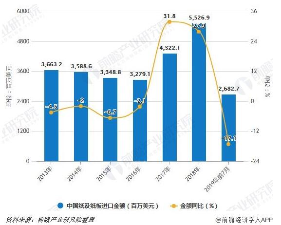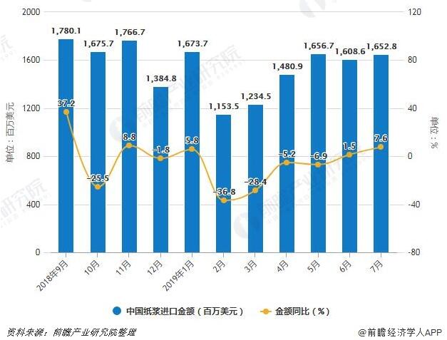 2018-2019年7月中國紙漿進口量、金額統計及增長情況