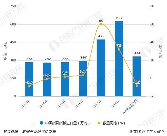 2019年前7月中國紙及紙板進口量達到334萬噸