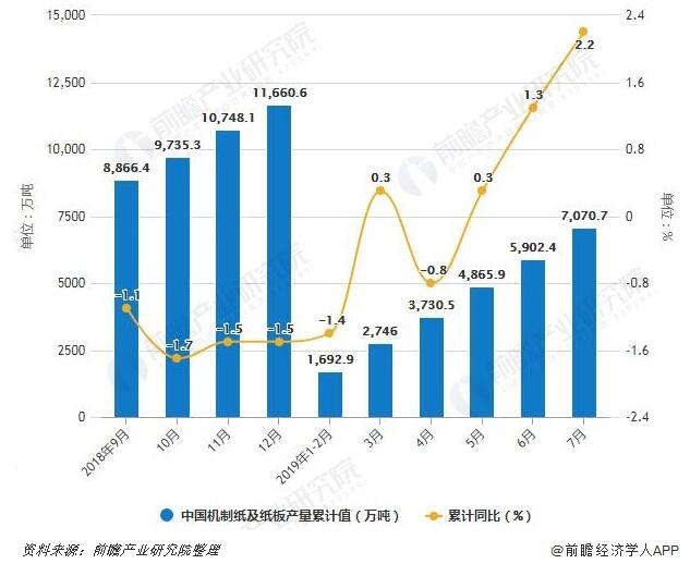 2019年前7月中國機制紙及紙板產量超7000萬噸