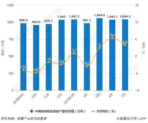 2018-2019年7月中國機制紙及紙板產量統計及增長情況