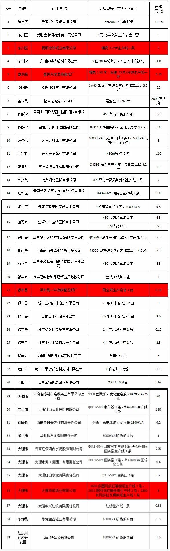 5月31日,筆者從云南省工信廳官網獲悉,該廳于近日公示了2019年淘汰落后和過剩產能完成情況,涉及造紙、鋼鐵、水泥等行業。其中,造紙行業共有10.32萬噸落后和過剩產能被淘汰,具體如下: