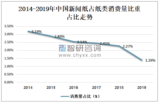 2014-2019年中國新聞紙消費量占比走勢