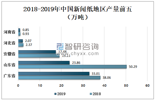 新聞紙是報刊及書籍的主要用紙,近年來,電子媒體盛行,報紙用紙量減少,新聞紙產量不復以往。2019年中國新聞紙地區產量排名第一帶的為廣東省38.06萬噸,第二名新聞紙產量為山東省23.86萬噸,第三名依舊是安徽省為17.48萬噸。