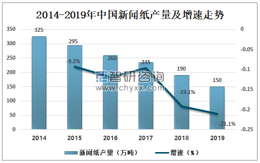 2014-2019年中國新聞紙產量及增速走勢