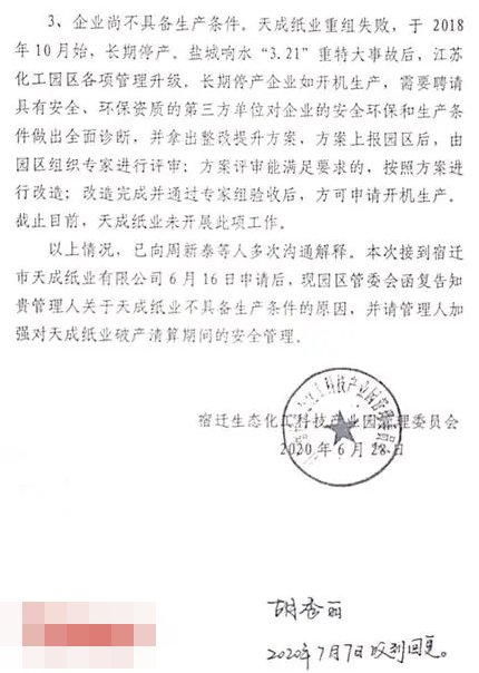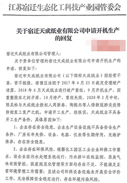一面說企業(yè)存在問題不能復(fù)工,一面又不給企業(yè)提出具體問題整改清單。申請企業(yè)復(fù)工5個月后,6月28日宿遷生態(tài)化工園給出了書面回復(fù):天成紙業(yè)不具備開機生產(chǎn)條件。原因有三:企業(yè)存在安全隱患;企業(yè)存在環(huán)保風險;重組失敗企業(yè)不具備生產(chǎn)條件。