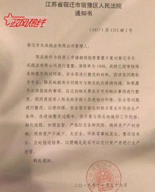 關(guān)于重組失敗問題。“宿遷天成紙業(yè)處于重整階段并非重整失敗,法院自始至終沒有下發(fā)重整失敗的文件。”陳吳松告訴記者,陳吳松說,從頭到尾,企業(yè)都不存在破產(chǎn)一說。“宿豫區(qū)人民法院于2019年11月27日通知投資人可以進場開展檢修,2020年4月16日再發(fā)通知,同意企業(yè)在管理人監(jiān)督下恢復(fù)生產(chǎn),說企業(yè)破產(chǎn),不是無稽之談嗎?”