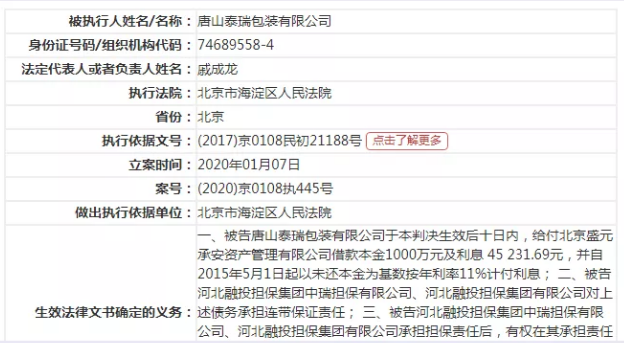 另一家名為唐山泰瑞包裝有限公司,涉案金額約為1004萬元,主要為償還某資產(chǎn)管理公司的借款本金及利息。