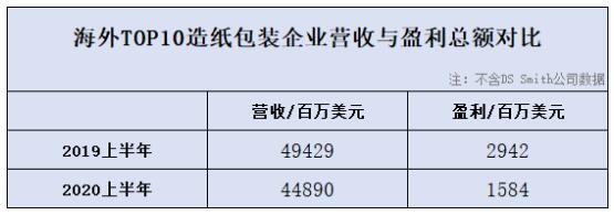 從圖表中不難看出,由于疫情肆虐,2020年上半年海外造紙包裝頭部企業營收及盈利水平普遍產生了不同程度的數據下滑。排除尚未披露數據的DS Smith,榜單上企業2020年上半年營收總額同比驟減近45.4億美元(折合人民幣約307億元),盈利總額下降近13.6億美元(折合人民幣約92億元)。