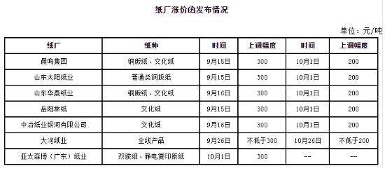 近期文化紙市場再現漲價函,不同于往次的月底發送,紙廠此次發布時間為中上旬,且把調價的時間節點定在了中旬,部分同時發布了下月初的漲價函,計劃中旬上調300元/噸,下月初再漲200元/噸,具體調價情況如下: