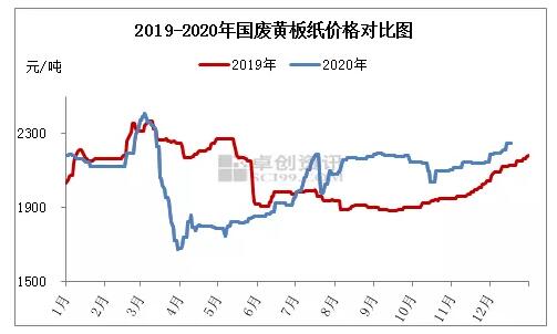 今年國廢主要品種之一的黃板紙價格走勢可分為兩個階段:1-5月,疫情沖擊下廢紙回收價格走高,一度沖破2300/噸高點,超過去年同期,但由于下游需求疲軟,進入6月后廢紙價格大幅跳水,三季度開始修復性反彈,四季度傳統(tǒng)旺季再度走高。同期,在原料廢紙的影響下,箱板瓦楞紙的價格也走出類似行情。