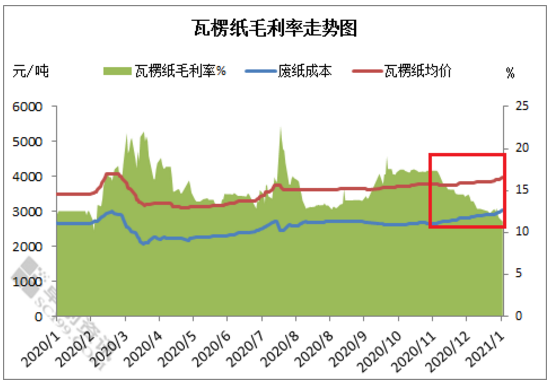 綜合原料成本漲幅在6.35%,原料成本上漲幅度大于瓦楞紙價格漲幅,因此紙價上漲,但瓦楞紙行業毛利呈下滑態勢。
