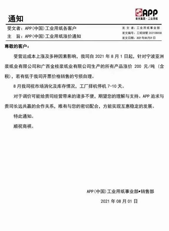 APP:擬對寧波亞洲漿紙業有限公司和廣西金桂漿紙業有限公司生產的所有白銅卡產品,從2021年8月1日起漲價200元/噸(含稅)。8月我司視市場消化及庫存情況,工廠擇機停機7-10天。