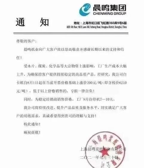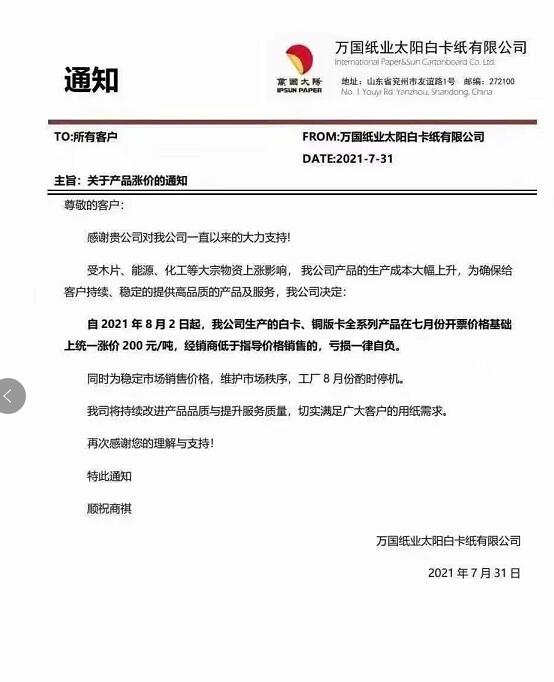 萬國太陽:自2021年8月2日起,我公司生產的白卡、銅版卡全系列產品在七月份開票價格基礎上統一漲價200元/噸。為穩定市場銷售價格,維護市場秩序,工廠8月份酌時停機。