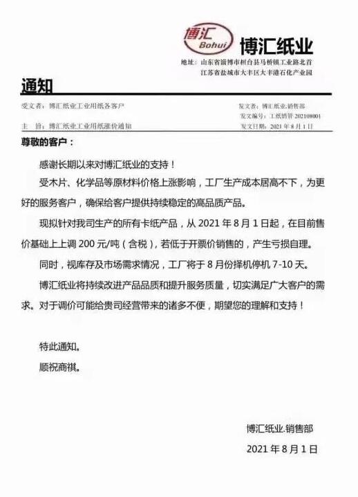博匯紙業:現擬對我司生產的所有卡紙產品,從2021年8月1日起,在目前售價基礎上上調200元/噸(含稅)。視庫存及市場需求情況,工廠將于8月份擇機停機7-10天。