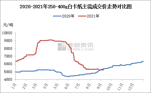 數據顯示,國內250-400g白卡紙價格在今年二季度達到9800元/噸左右的階段性高點,此后伴隨原料木漿價格持續下行,至今仍在6000元/噸上下低位徘徊,回落到去年同期水平。值得注意的是,去年白卡紙價格伴隨9月消費旺季來臨逐漸走強,但今年能否復制行情面臨較大不確定性。