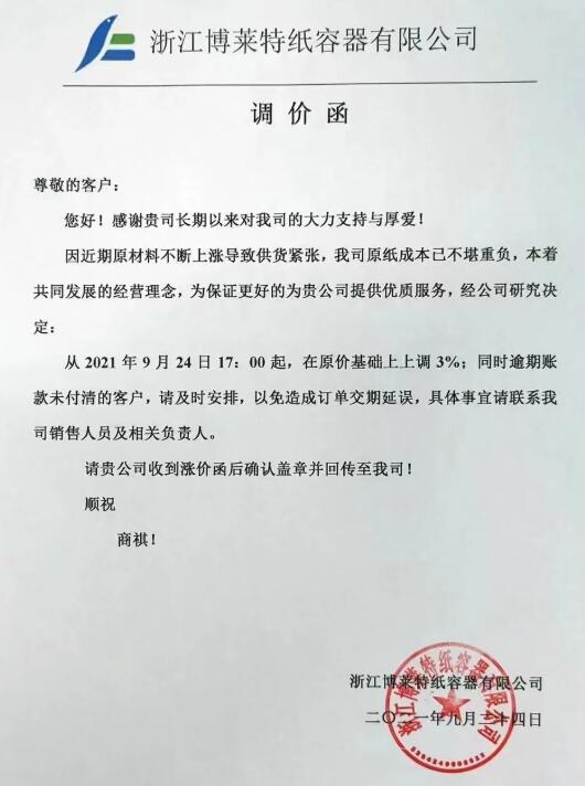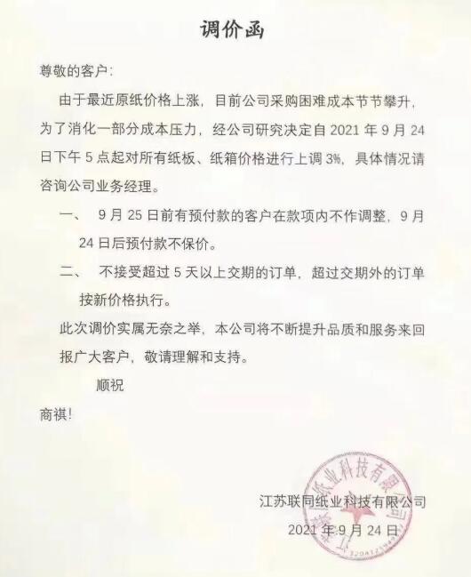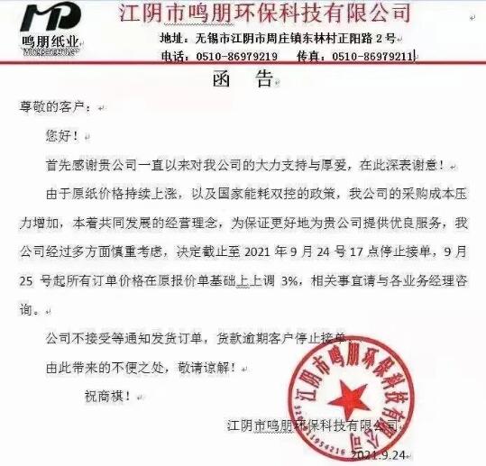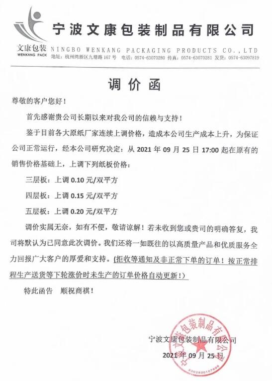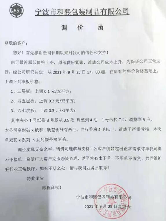 9月25日,寧波市大批紙板廠繼續跟進。慈溪福山、寧波春輝、文康包裝、新成包裝、和熙包裝…短短一個多小時內數家紙板廠發布漲價函,預計更多地區、更多工廠的漲價函也將在這兩天陸續發布。這場始于限電停機的漲價潮洶涌來臨!