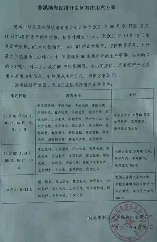 根據慈溪中科眾茂環保熱電有限公司于9月26日發布的《慈溪濱海經濟開發區有序用汽方案》顯示,該熱電公司計劃于9月30日至10月11日對#5爐進行停爐檢修,檢修時間為12天,在此期間,龍山工業區、濱海經濟開發區熱電用戶采用均衡供汽、有序用汽生產方式。