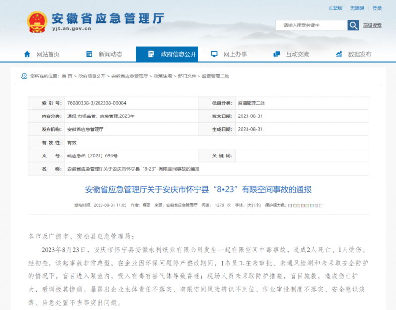 安徽省應急管理廳關于安慶市懷寧縣“8•23”有限空間事故的通報